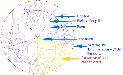 It is hard to find a tree in an urban area that has a root circle described by the canopy that is not interrupted by structures or property lines but for this explanation we will assume a perfectly placed root zone making a nice circle.You will probably have to imagine the circle. Now, the distance from the trunk to the ends of the branches is the radius of the canopy. Divide that distance by three and increase the radius of you circle by the amount you get. That is one third added to the radius of the canopy. That will define the size of the circle you are to work with. It varies widely by circumstances and species. A tree that is growing next to a house will have its roots mostly on the side away from the house. Other man made and natural obstacles impede the development of a natural full root system. Consider these factors when selecting a place to water. Once you have defined your circle, slice it like a pie into three to six pieces depending on the circumstances and water one of those slices of soil. If you keep the moisture available long enough, the entire tree and maybe its neighbors will get a good drink. It is, of course, better to water the entire roots zone, but that is quite a bit more difficult. Nature does it best with good, slow, long rain.